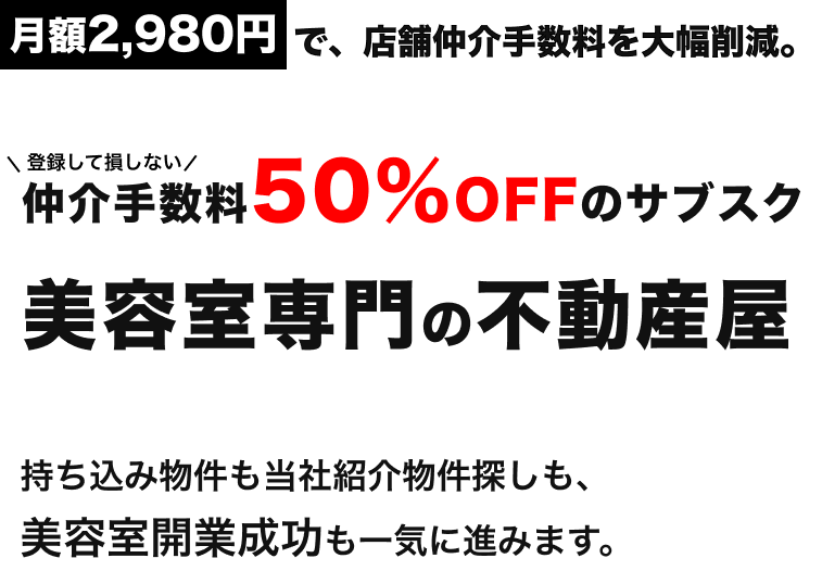 開業コストを“最も減らせる”のは このサブスクです。持ち込み物件も当社紹介物件探しも、 美容室開業成功も一気に進みます。